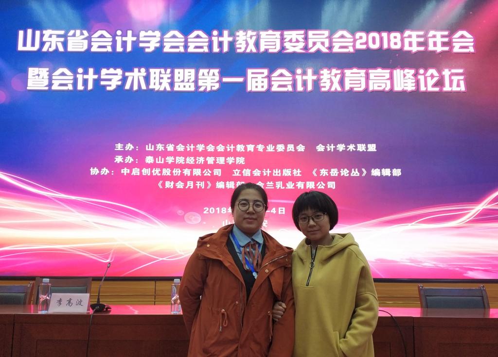 11月2日-4日,我系教师靳霞、解云惠应邀前往山东泰安参加山东省会计学会会计教育专业委员会2018年年会暨会计学术联盟第一届会计教育高峰论坛。