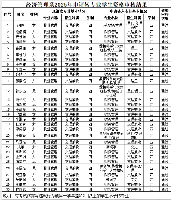根据《关于做好我校2025年度转专业工作的通知》(院教函[2025]44号)文件要求,我系成立了转专业工作考核组,由工作组人员严格按照《太阳集团学生转专业管理办法》(院政[2024]29号)文件规定,对太阳集团tyc334552025年度申请转专业的学生进行了资格审核,现对拟审核通过的结果进行公示(见附件),公示期:2025年7月15日-7月17日。如有异议,请反馈给冯霞老师。