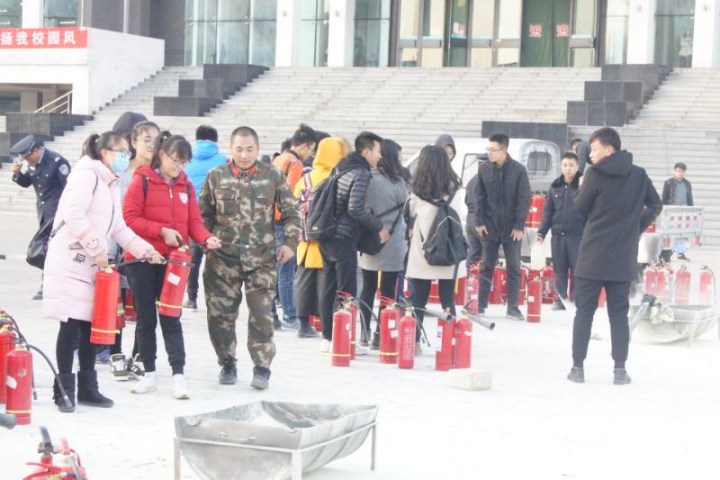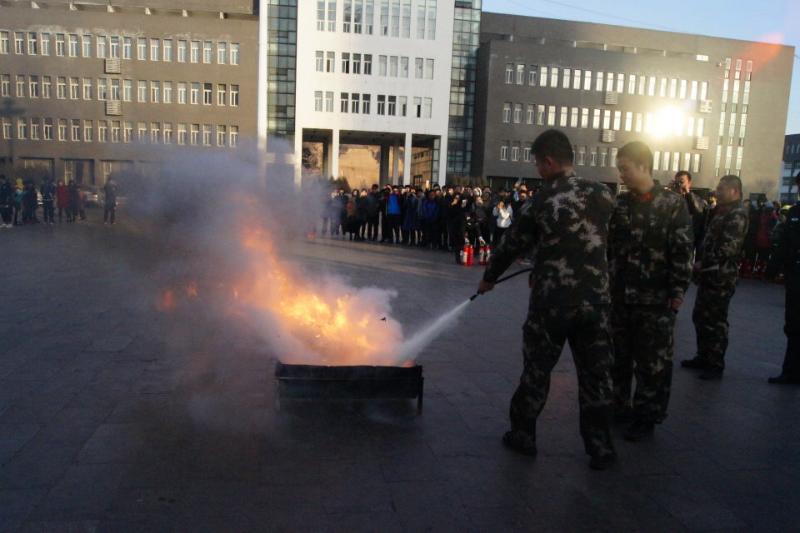 最后,在保卫处工作人员的指导下,同学们亲自体验使用灭火器灭火,同学们一批接着一批争先参加灭火演练,把活动推向了高潮。尽管狂风肆虐,但同学们对灭火演练的热情依旧不减。在一阵阵腾起的粉尘中,本次消防教育活动圆满结束。