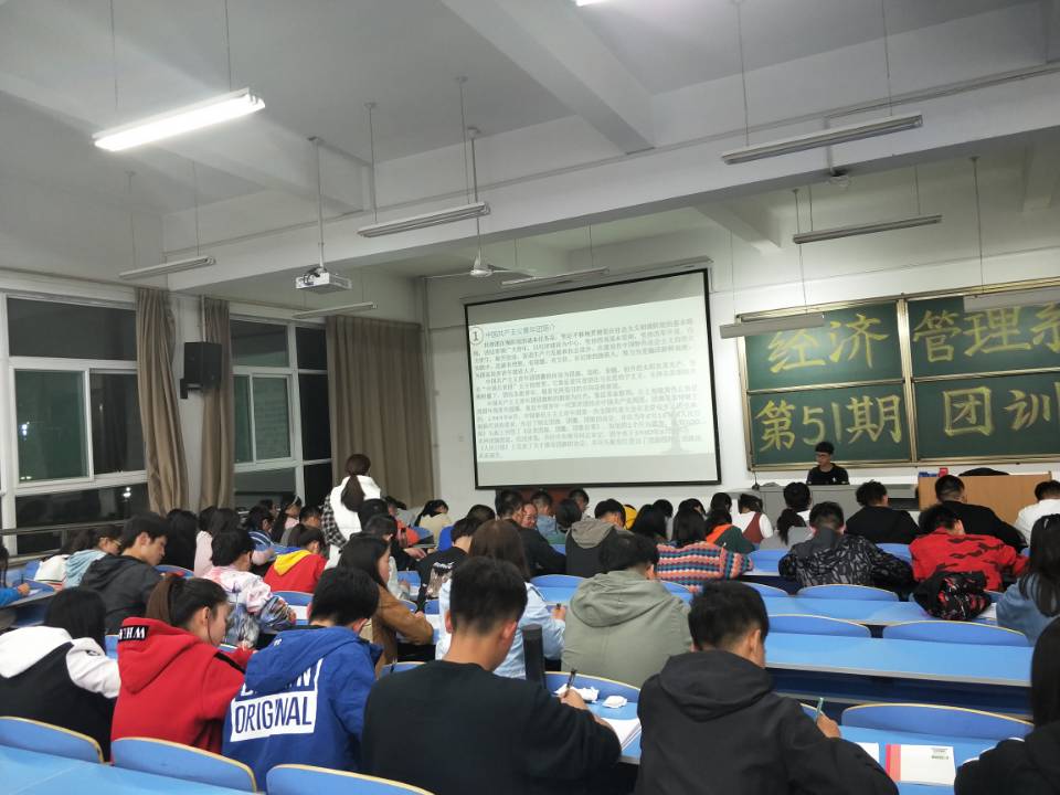 在简单的概括介绍后,副书记王晓丽又具体的介绍了本次团训的四大主题:主青团简介,如何改进青年思想政治工作,习近平总书记系列重要讲话,如何提高学生干部综合能力。主讲从这几个主题入手,介绍了共产主义青年团及提高个人能力和工作水平的方法,阐述了共青团员的优秀精神和品质,参训同学认真听讲并做好了相关笔记。
