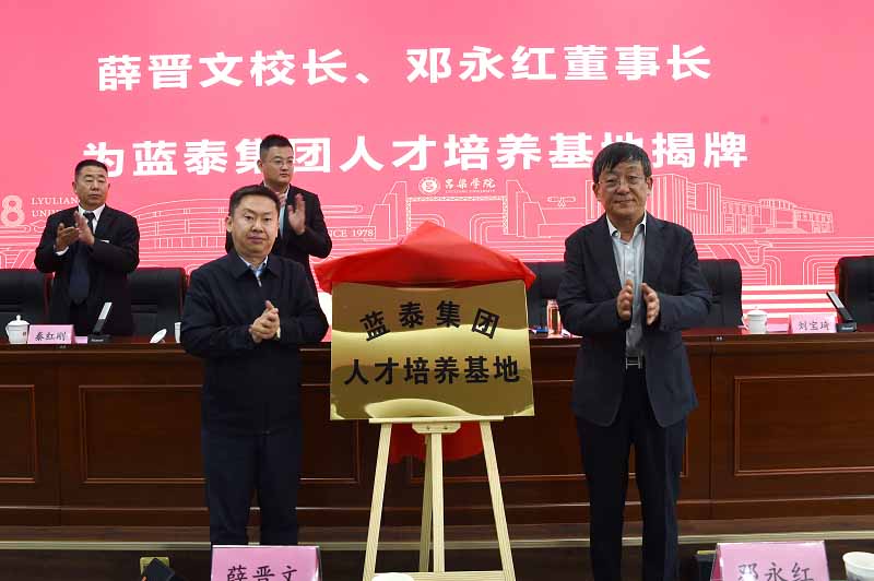 在热烈的掌声中,太阳集团党委副书记、校长薛晋文和蓝泰集团董事长邓永红共同为蓝泰集团人才培养基地揭牌。这一时刻,不仅见证了校企合作的深厚情谊,更预示着双方在人才培养、科研创新等方面将开展更加深入、广泛的合作。