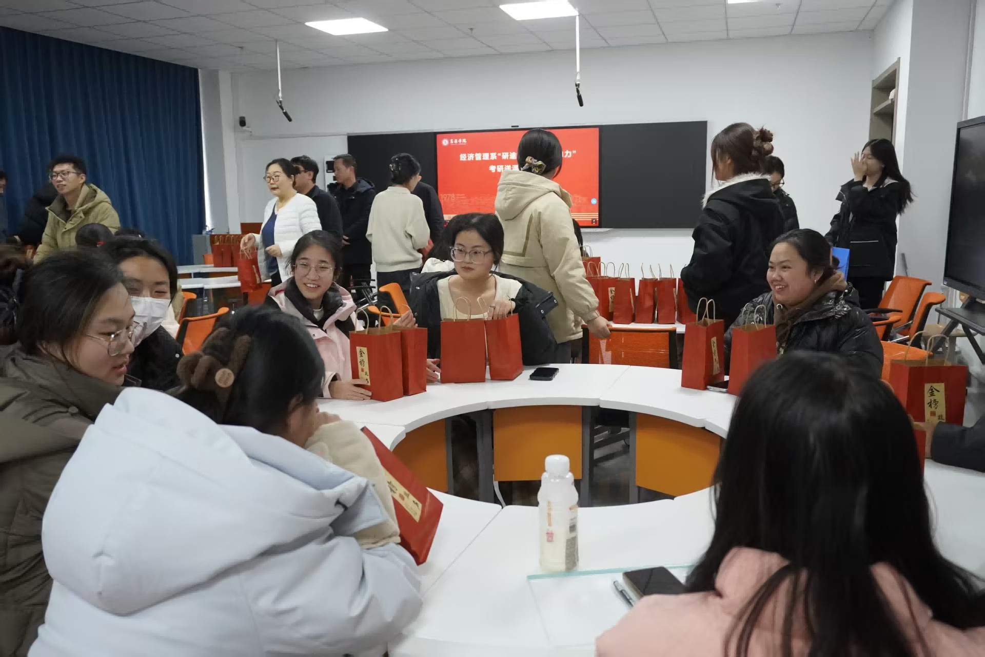 随后,老师们为考研学子们送上精心准备的 “暖心加油包”。红彤彤的礼品袋里,寓意 “一战‘橙’硕” 的橙子、印有 “逢考必过” 字样的文具、励志钥匙扣、“金榜题名” 糖果等礼物整齐摆放,每一份礼物都承载着全系师生的美好祝愿,既实用贴心,又充满了励志寓意。