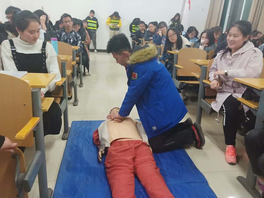 讲座开始,主讲人武晋率先播放了一段小视频,向大家介绍了蓝天救援队和红十字志愿服务队。接着,武晋用PPT演示、模拟演练,为大家讲述了救护常识、救护选择以及救护程序,并恰当地实施心肺复苏、常见急救法、外伤包扎等危急时刻的处置方法,为病人争取更多的抢救时间,挽救更多的生命。每一种科学急救知识都颠覆了同学们过去所谓的“常识”,每一种正确施救的姿势都吸引同学们在现场自发练习和模仿。短短的两小时干货满满,同学们收获的不仅是知识,还有对生命之重的认识。讲座临近尾声时,现场许多同学依然意犹未尽。