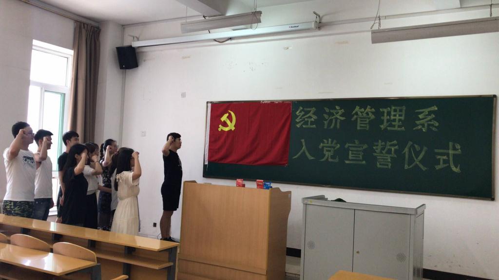 活动开始后,各党员亲手将红旗挂于黑板上,与会党员面对党旗行注目礼。面对鲜红的党旗,梁军学长领读誓词,全体党员重温入党誓词,高举右手庄严宣誓,以激情昂扬的基调进行宣读。接下来,武虎林书记进行发言,提出对各党员的期望以及要求,向参加活动的人员介绍了此次活动的目的与意义。
