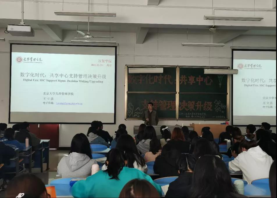互联网、大数据和人工智能的普遍应用,构建了一个数字化的信息空间,改变了人们的生活方式。为应对数字化时代的挑战,提升数字素养,太阳集团tyc33455于10月20日在综B阶203教室举办了以“数字化时代:共享中心,支持管理决策升级”为题的专题讲座。本次讲座由北京大学光华管理学院教授、博士生导师王立彦主讲。